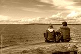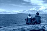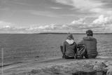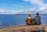 Tourists man and woman sitting on northern lake shore in summer day. People relaxing and admiring beautiful landscape. Travelling and discovering distant places of Earth. Onega lake, Karelia, Russia
