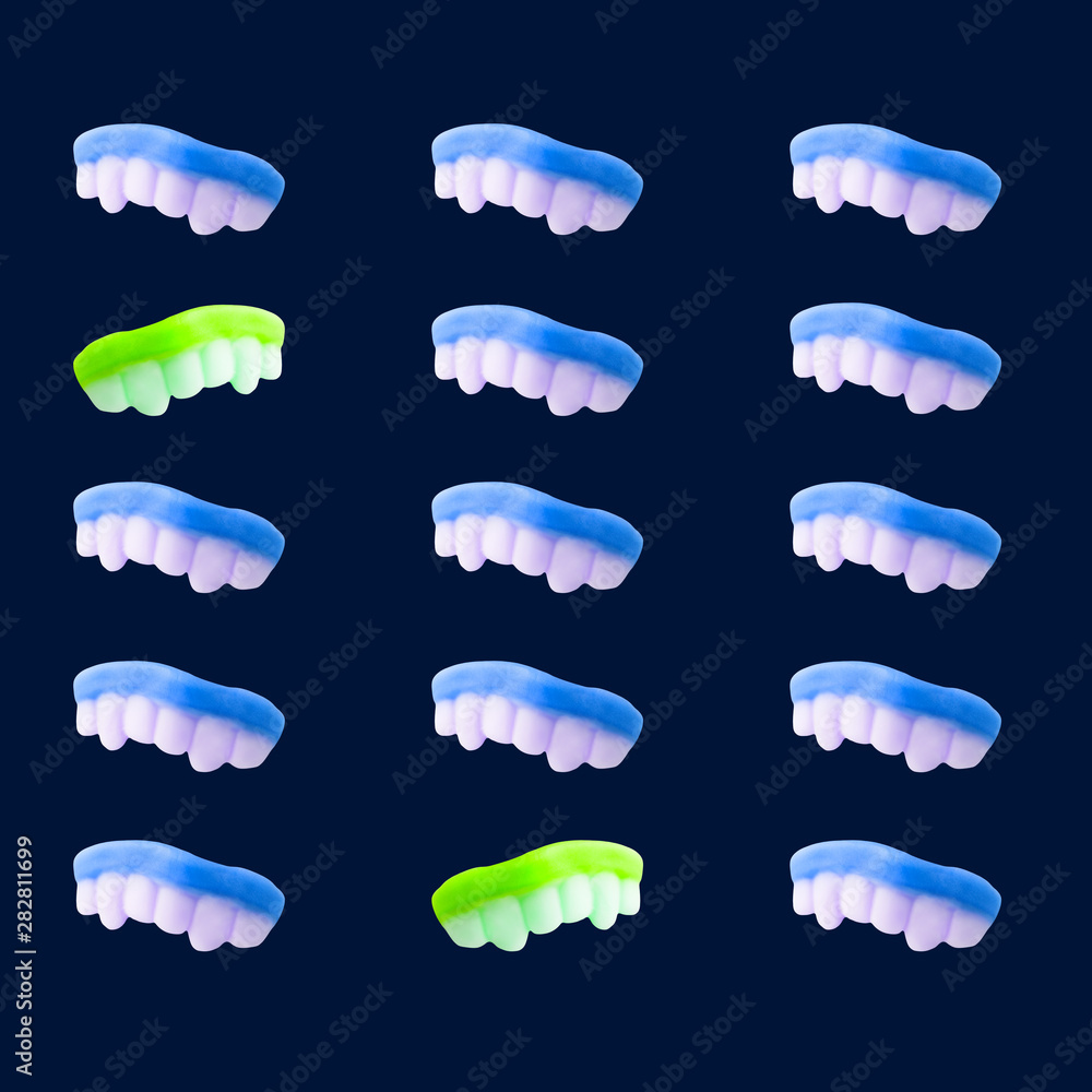 Photography collage of trendy neon colors human teeth on dark blue background top view flat lay isometric pattern.Halloween symbol.Poster in pop-art and style