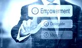 A businessman selecting a button on a futuristic display with a Empowerment concept written on it.