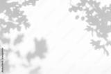 Gray shadow of the hawthorn tree leaves on a white wall. Abstract neutral nature concept blurred background. Space for text. Overlay effect for photos and mockups.