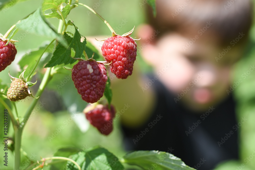 Little boy picking raspberries in garden. Selective focus, Child picking and eating ripe raspberries