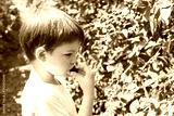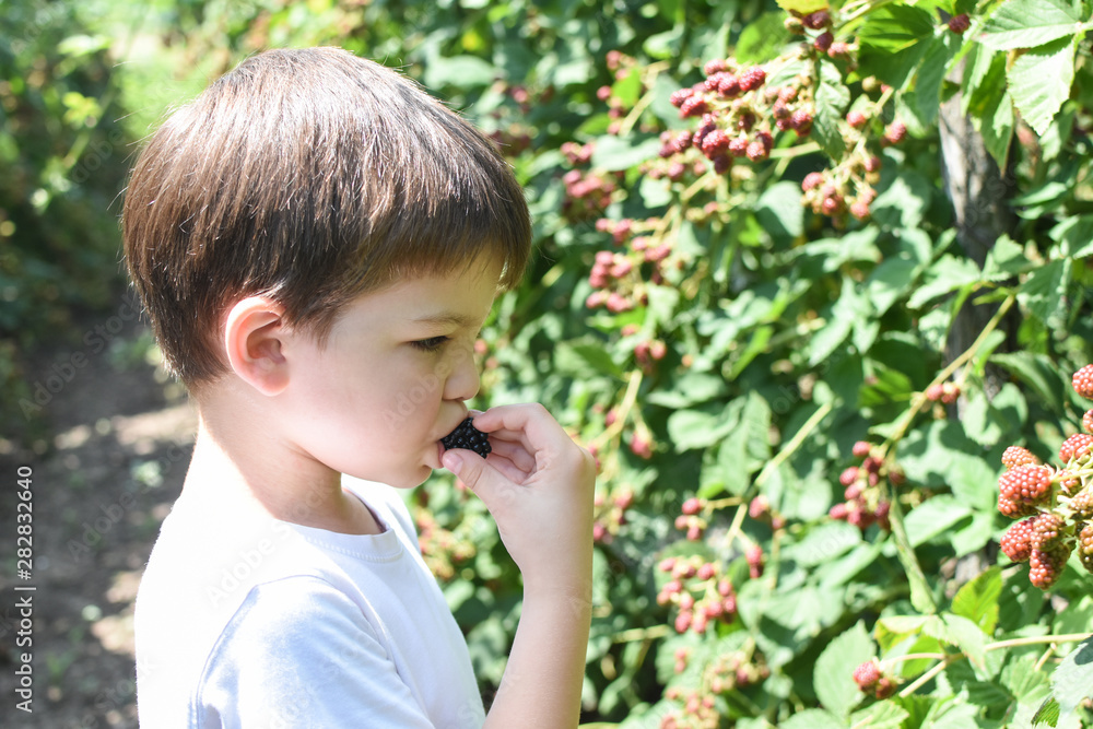 Little boy picking blackberries in garden. Child picking and eating ripe blackberry