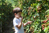Little boy picking blackberries in garden. Child picking and eating ripe blackberry