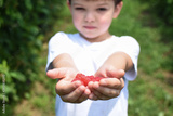 Organic ripe raspberries child hand. Selective focus, Boy picking and eating ripe raspberries in garden