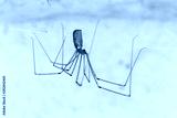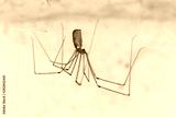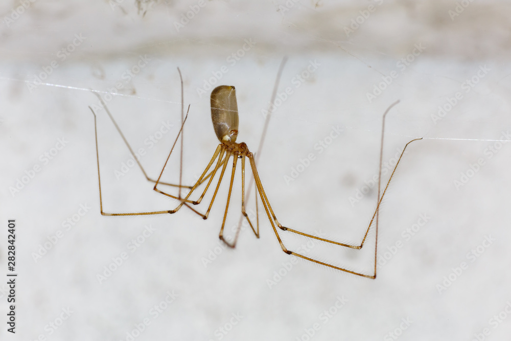 Pholcus phalangioides. Araña de patas largas colgando de su tela.