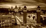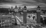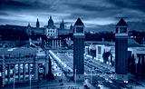 Barcelona, Spain. Nighttime top view at Spanish Square with tower and national palace art museum Catalonia far away.