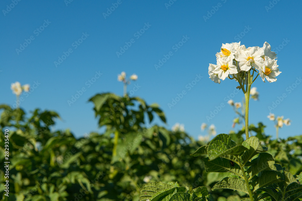 Blooming potatoe flower in a field of potatoe plants on a blue sky with space for copy