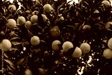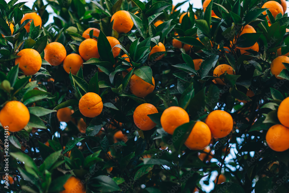 closeup of ripe oranges on a tree with green leaves. fruits.
