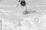 Dog pug is standing in the snow in winter landscape