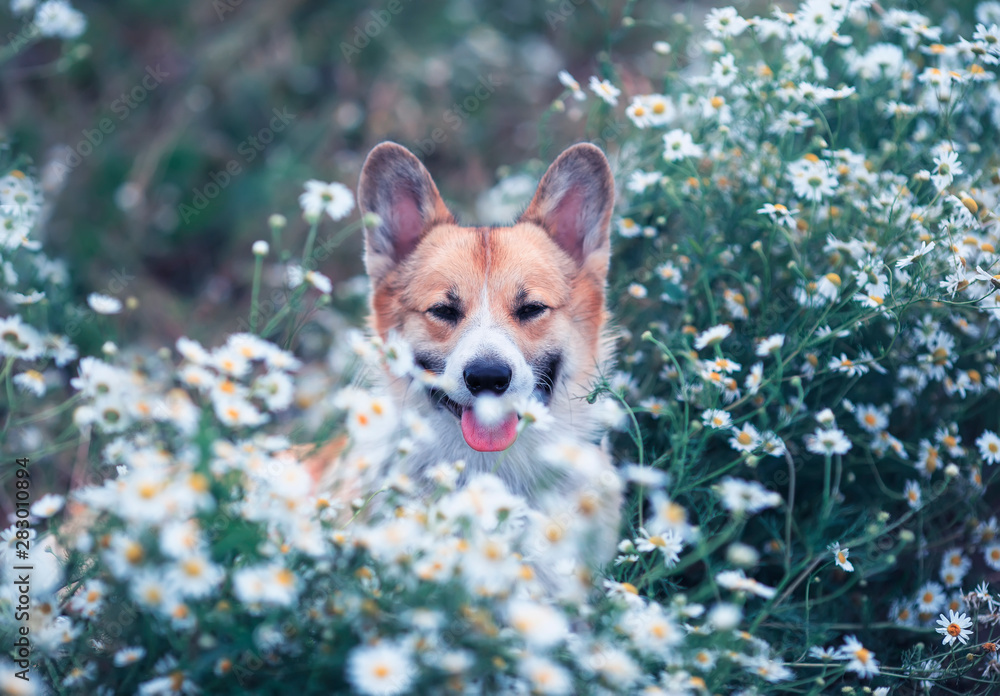 puppy dog red Corgi sits in a meadow surrounded by white chamomile flowers on a Sunny summer clear day