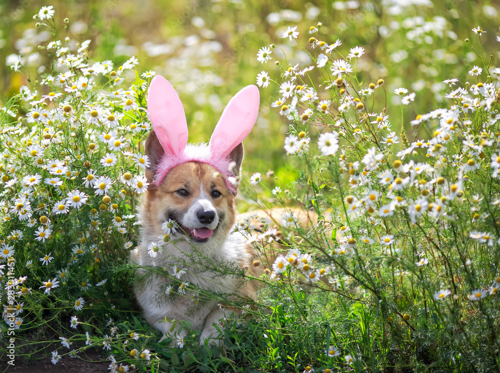 happy puppy dog red Corgi in festive Easter pink rabbit ears on meadow lies in white chamomile flowers on a Sunny clear day