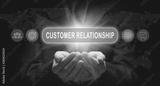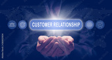 Businessmans cupped hands holding a Customer Relationship business concept on a computerised display.