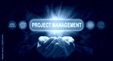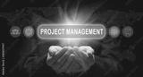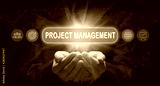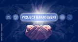 Businessmans cupped hands holding a Project Management business concept on a computerised display.