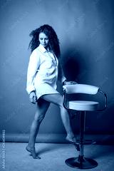 Sexy woman 40 years old in a white shirt on a gray studio background.
