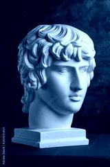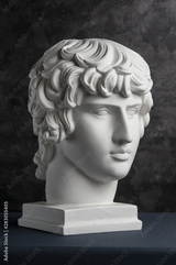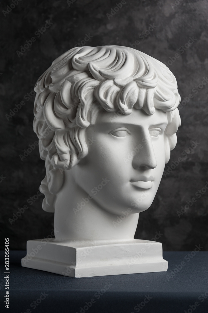 Gypsum copy of ancient statue Antinous head on dark textured background. Plaster sculpture man face.
