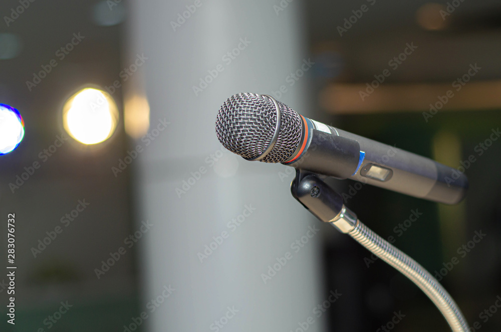 Close up Microphone for broadcast karaoke or on stage. Mic is on stage in the conference room.