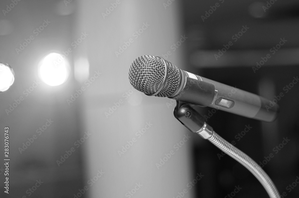 Close up Microphone for broadcast karaoke or on stage. Mic is on stage in the conference room.