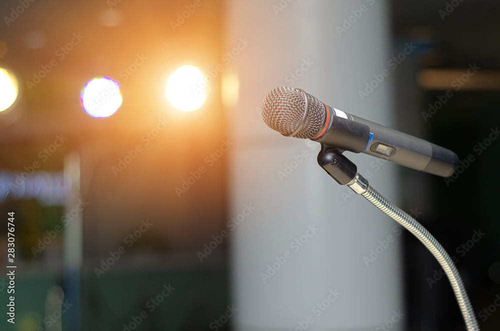 Close up Microphone for broadcast karaoke or on stage. Mic is on stage in the conference room.