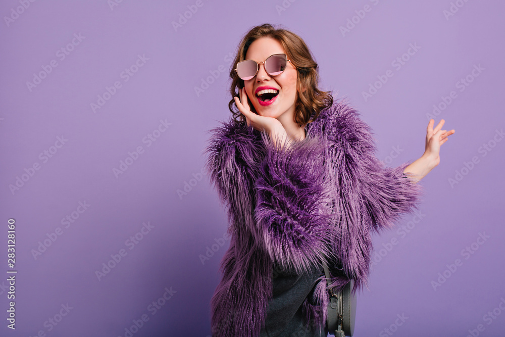 Adorable woman expressing true positive emotions during photoshoot in purple fur coat. Indoor portrait of active glamorous girl standing in cofident pose and smiling.