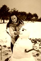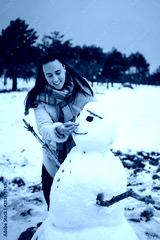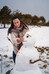 Lovely warm woman putting a carrot nose on a snowman - Vacation concept