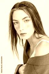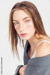 Portrait of slim brown-haired young woman in male jacket looking at camera isolated on white background