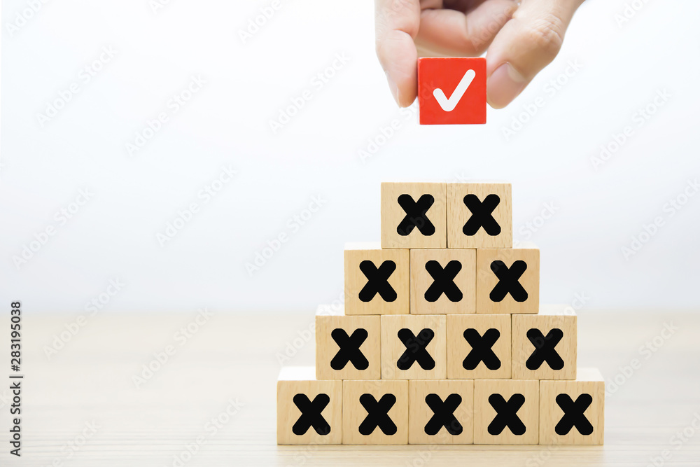 Wooden Block with check mark and cross icons for change to success concept.
