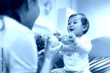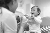 Young little Asian baby holding balls and toys playing with female preschool teacher in classroom. Kid looking at nanny that teaching her with smile, enjoy learning in education development class.