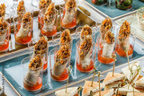 Delicious appetizers in glass cups on banquet table. Catering food, canape and snacks
