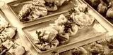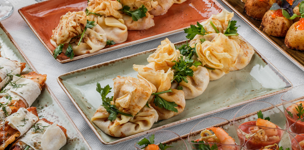 Delicious appetizers stuffed crepes with mushroom julienne sauce and greens on banquet table. Catering food, canape and snacks