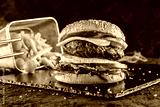 Tasty burger with cheese brie, blue cheese, mozzarella, tomatoes, arugula and fried stick balls, french fries on slate black background, close up
