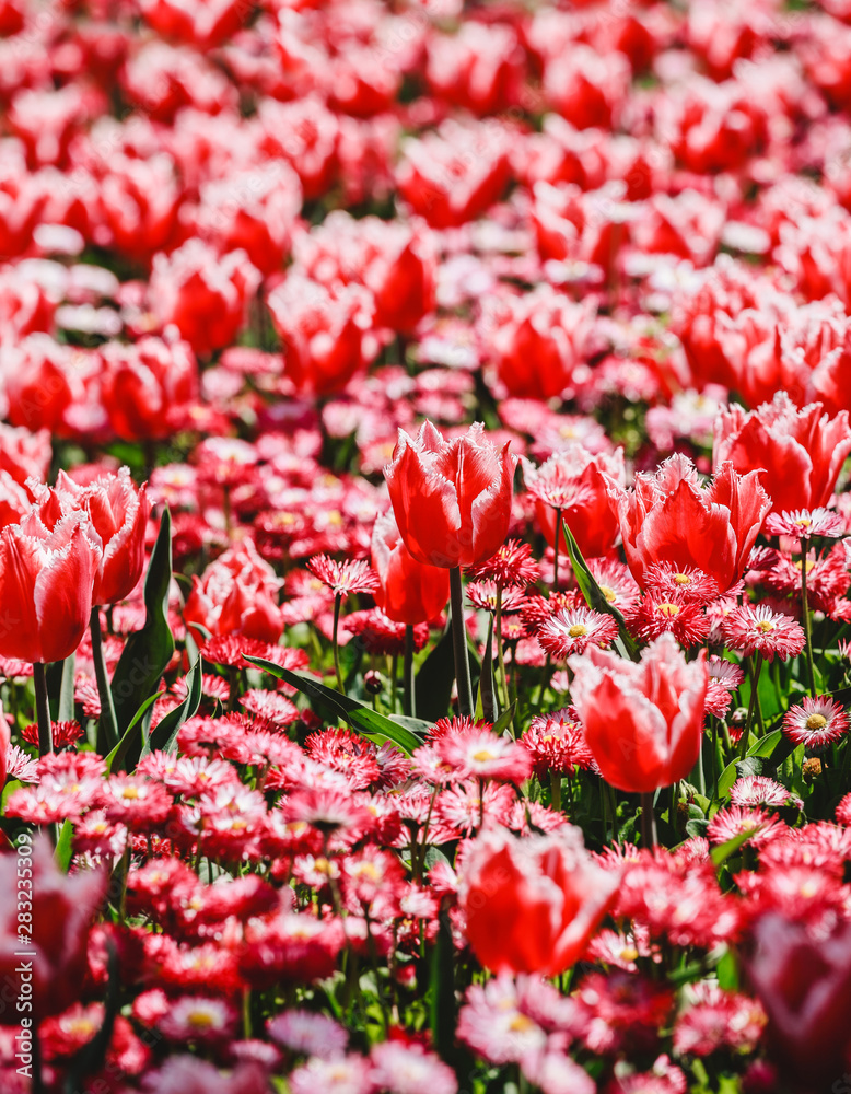 Colorful tulip field, purple flower tulip in spring background, selective focus, closeup. Beautiful pink spring tender flowers blossom