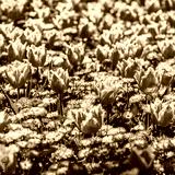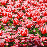 Colorful tulip field, purple flower tulip in spring background, selective focus, closeup. Beautiful pink spring tender flowers blossom