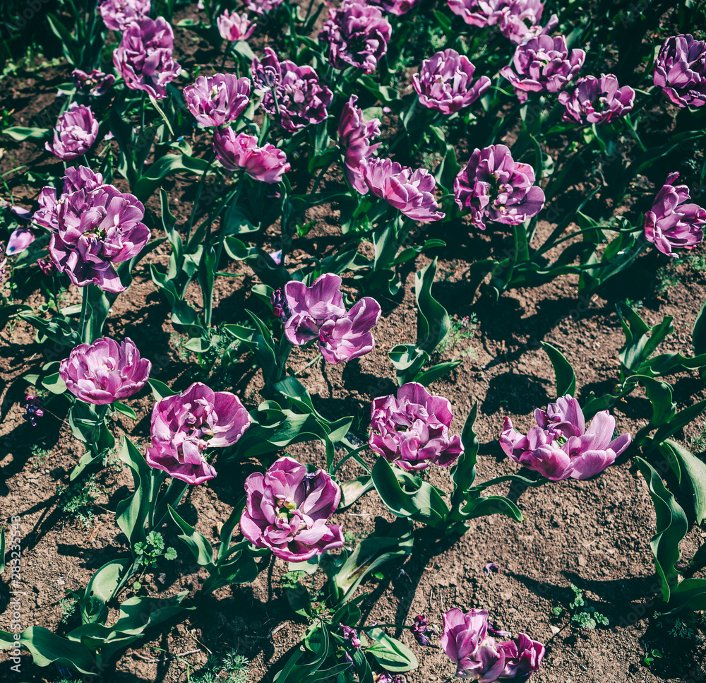 Colorful tulip field, flower tulip in spring background, selective focus, closeup. Beautiful violet peonies flowers blossom in spring background, toning
