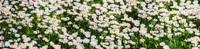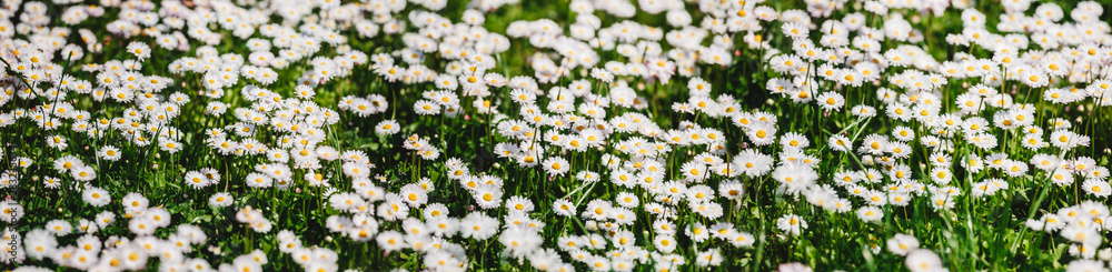 Chamomile field flowers or daisies flowers blooming in sunlight background. Summer flowers, selective focus, wide composition