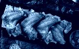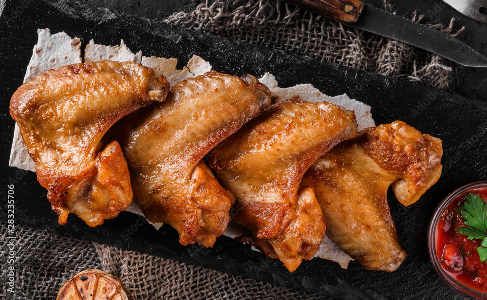 Grilled chicken wings meat with tomato sauce on slate board over dark background. Top view