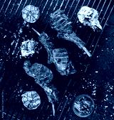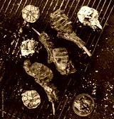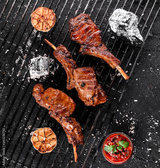 Grilled lamb ribs meat or rib eye with tomato sauce over the coals on a barbecue, dark background. Top view