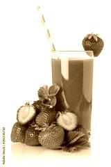 Strawberry smoothie fruit juice drink straw strawberries in a glass isolated on white