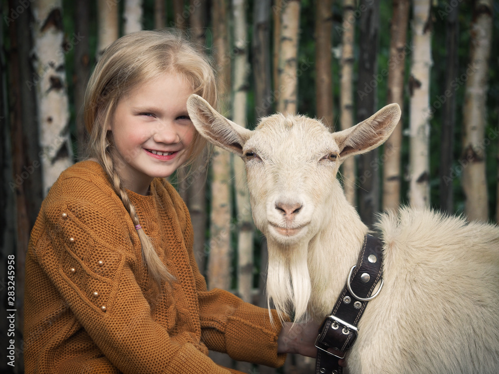 A child and a goat. Portrait of a girl with a farm animal on the farm