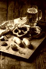 White german sausage, brezel, mustard and beer. Oktoberfest food. Traditional bavarian white sausage in beer gaten on wooden table.