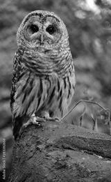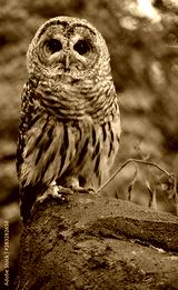 The barred owl (Strix varia), also known as northern barred owl or hoot owl, is a true owl native to eastern North America. Adults are large, and are brown to grey with barring on the chest