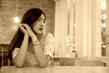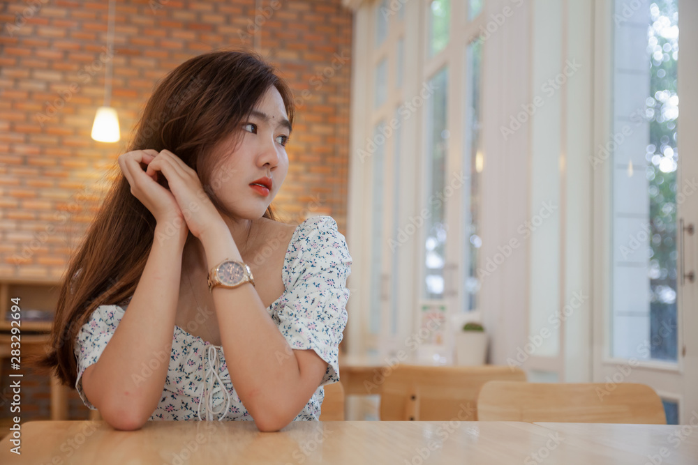 Asian woman relaxing to wait hot coffee latte art at coffee cafe .