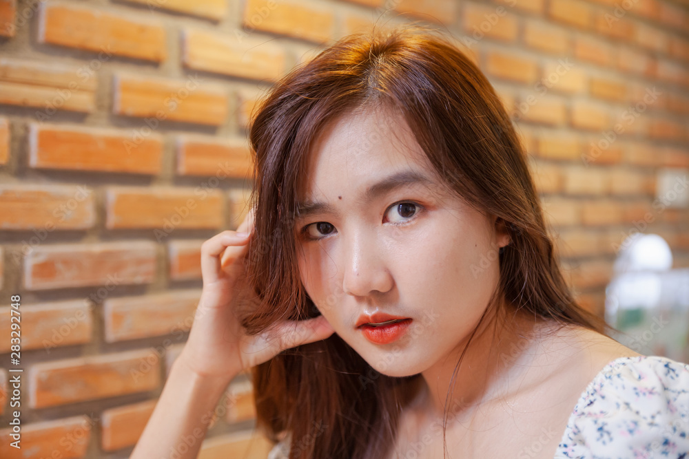Asian woman relaxing to wait hot coffee latte art at coffee cafe .