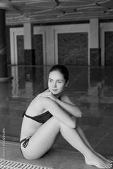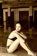Portrait of beautiful in bikini woman relaxing in swimming pool spa in resort relax spa hotel. Holidays vacation. Body health care, Beauty concept. Lifestyle.