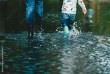 Close-up legs of mothers and son in the summer puddles. Rear view