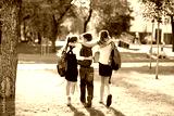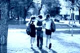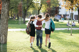 school friends a boy and two girls with school backpacks on their backs walk after class
