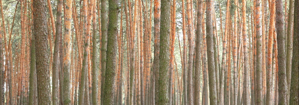 Pine forest with beautiful high pine trees in summer in sunny weather
