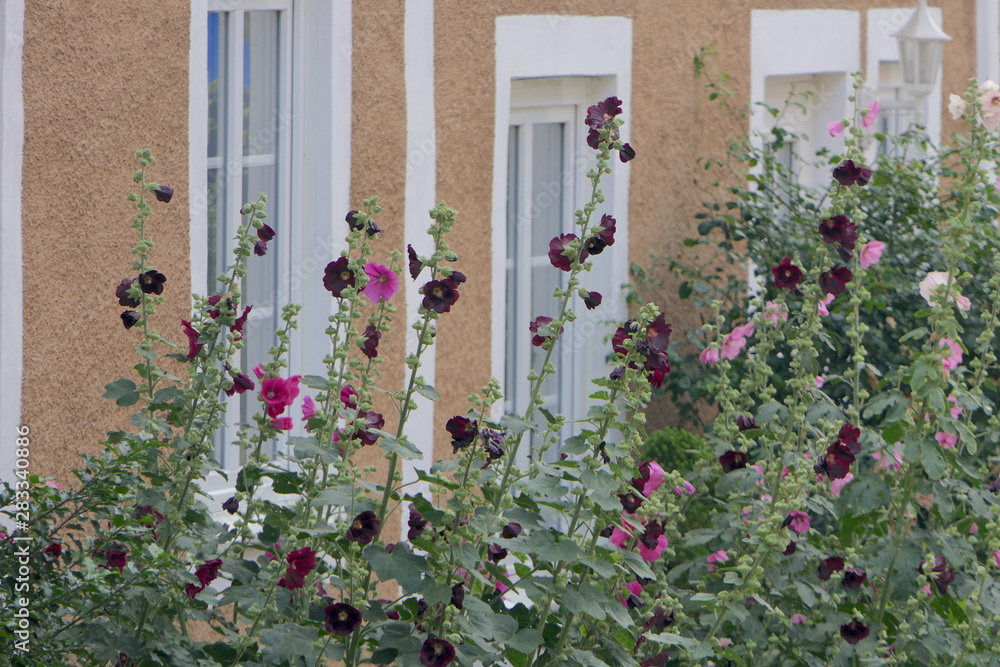 Stockrosen vor Haus