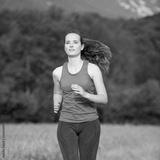 Beautiful young woman workout outdoor runs across meadow in early summer