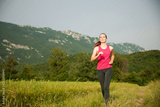 Beautiful young woman workout outdoor runs across meadow in early summer