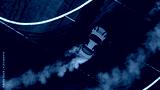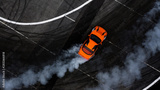 Aerial top view car drifting on asphalt race track with lots of smoke from burning tires.